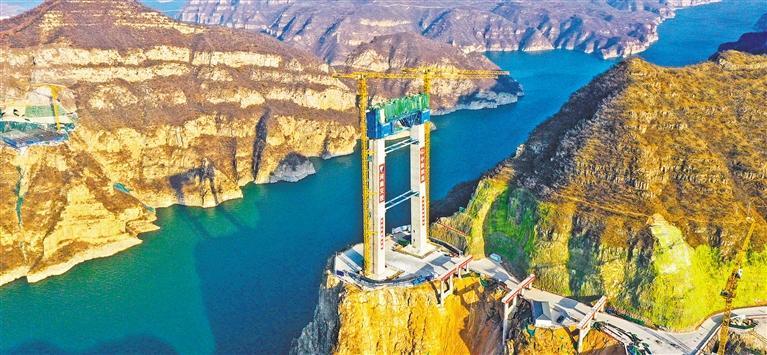 1月9日拍摄的河南省济源至新安高速公路项目黄河大桥建设现场。大桥位于小浪底大坝上游30公里处,是济源至新安高速公路的控制性工程,该桥高109米的主塔已于近日封顶。