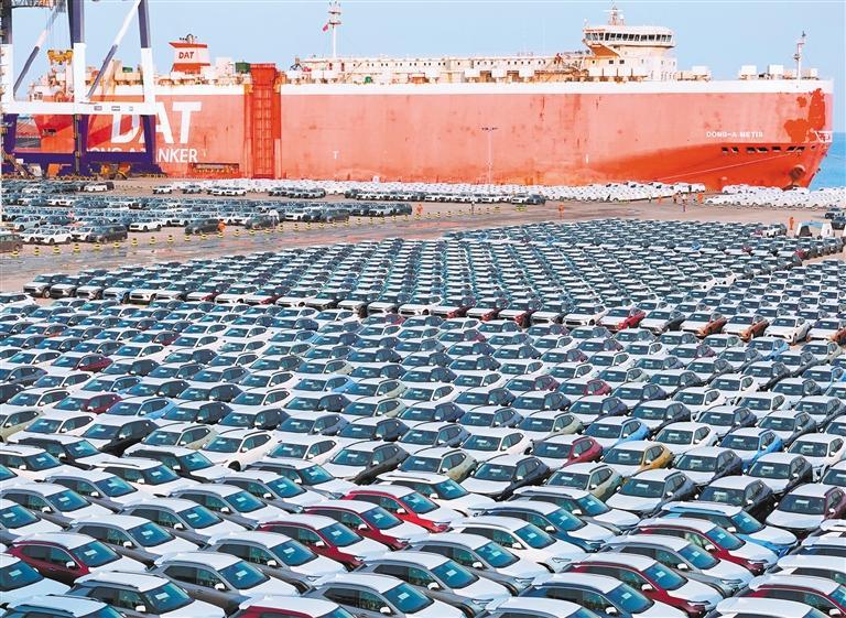 ⑦1月8日,国产汽车在山东港口烟台港集结等待装船出口。该港是我国北方商品车物流枢纽港和我国最大的商品车国际中转港。
