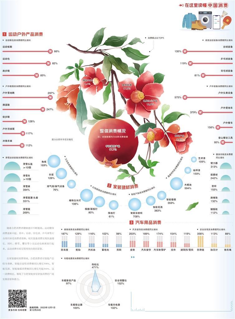 合肥市2023年12月的线上消费数据让人眼前一亮,户外雪地靴消费额同比增长297%、户外仪表设备增长575%、木蜡油增长594%……