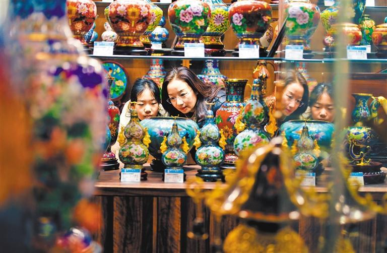 近年兴起的国潮消费中,各种样式的景泰蓝主题文创作品应运而生,钥匙链、书签、抱枕等设计独特、做工精美的工艺品,深受消费者青睐,让景泰蓝工艺品在新时代绽放新华彩。