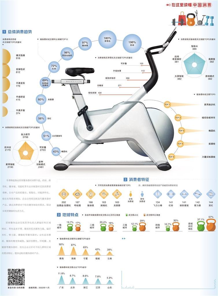 进入冬季以来,气温降低导致大众户外运动的意愿和频率普遍降低,居家健身消费市场迎来明显升温。数据显示,2023年11月以来,消费者对居家健身器材的消费需求显著增长,滑雪机、健身镜、风阻划船机、杠铃等健身产品增长亮眼。随着大众健康意识持续提升和智能健身设备家庭普及率的提高,居家健身成为日常生活的一部分。