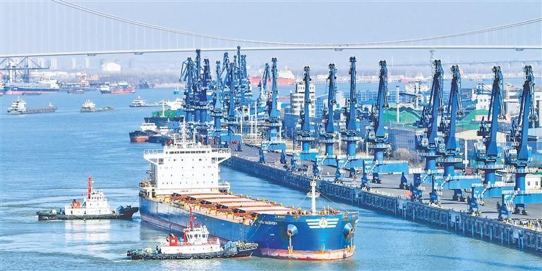 1月15日,利比里亚籍“阿尔法发现”轮正在南京港靠泊。据介绍,该船吃水达11.6米,刷新南京港开埠以来吃水最深的纪录。近年来,长江航运条件不断改善,“黄金水道”作用更加凸显。史 俊摄(中经视觉)