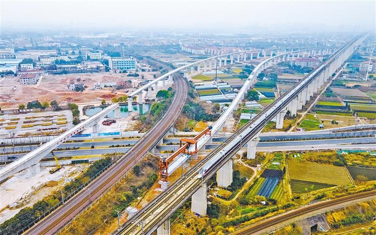 1月15日,浙江省金华市婺城区乾西乡金建铁路项目施工现场,建设者加快推进箱梁架设。该铁路自金华站引出,在建德站接入杭黄高铁,计划2025年10月底具备开通条件。胡肖飞摄(中经视觉)