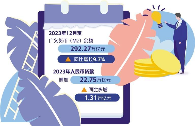 1月12日,中国人民银行公布的2023年金融统计数据显示,2023年12月末,广义货币(M_2)余额292.27万亿元,同比增长9.7%。2023年人民币贷款增加22.75万亿元,同比多增1.31万亿元。2023年12月末,社会融资规模存量378.09万亿元,同比增长9.5%,增速比上月高0.1个百分点。12月份增量为1.94万亿元,比2022年同期多6169亿元。全年增量累计为35.59万亿元,比2022年同期多3.41万亿元。2023年12月份,人民币贷款增加1.17万亿元,同比少增2401亿元。