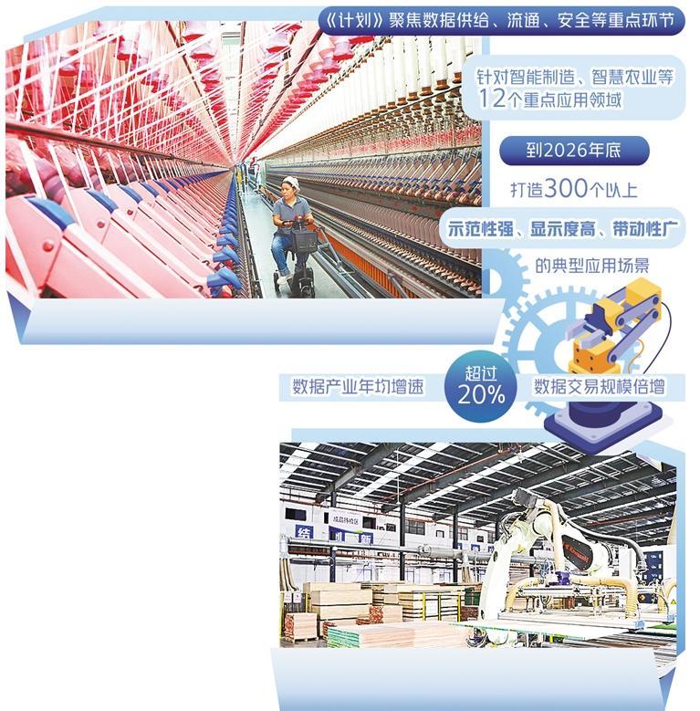 国家数据局等多部门近日印发《“数据要素×”三年行动计划(2024—2026年)》(以下简称《计划》),提出到2026年底,数据要素应用广度和深度大幅拓展,在经济发展领域数据要素乘数效应得到显现,打造300个以上示范性强、显示度高、带动性广的典型应用场景。数据产品和服务质量效益明显提升,数据产业年均增速超过20%,数据交易规模倍增。