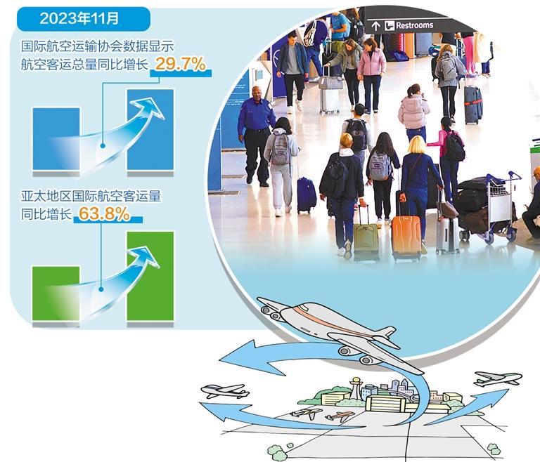 航空客运市场目前已恢复至疫情前水平。国际航空运输协会发布的最新数据显示,2023年11月航空客运总量同比增长29.7%,恢复至2019年11月水平的99.1%。其中,亚太地区国际航空客运量同比增长63.8%,是增长率最高的区域。国际航协理事长威利·沃尔什表示,全球经济逆风而行并没有阻碍国际旅行的复苏,虽然国际旅行仍比疫情前水平低5.5%,但这一差距正在迅速缩小。