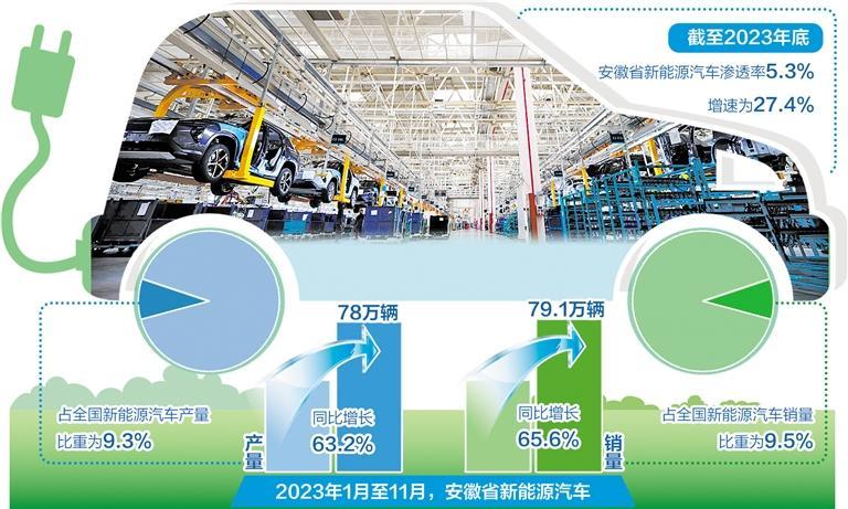 新能源汽车产业具有技术、人才、资金密集的特点,产业链条长、辐射范围广、带动能力强。作为全国新能源汽车版图的重要一极,安徽系统谋划发展汽车这一首位产业。最新数据显示,2023年1至11月,安徽省新能源汽车产销分别完成78万辆和79.1万辆,同比分别增长63.2%和65.6%,占全国比重分别为9.3%和9.5%,新能源汽车产业发展势头持续稳定向好。