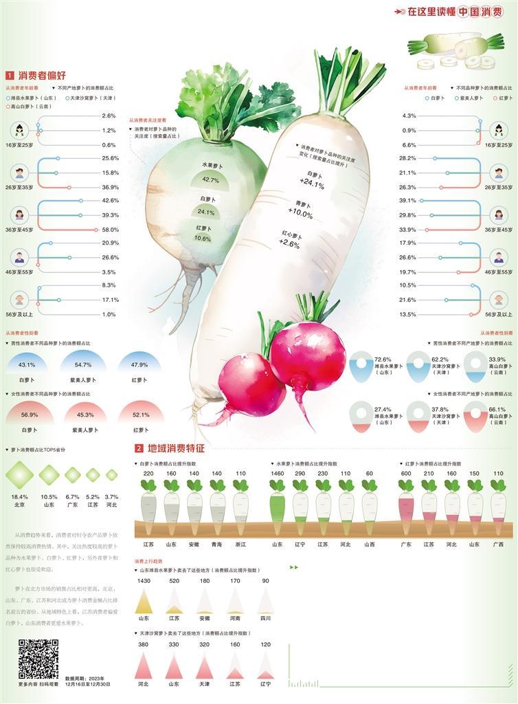从线上销售趋势来看,水果萝卜、白萝卜、红萝卜、青萝卜和红心萝卜等产品的热度最高。今冬蔬菜价格偏低,虽然萝卜是“大路菜”,但有了地理标志“金名片”加持,也能获得不错的销售反响。数据显示,地标农产品天津沙窝萝卜、山东潍县水果萝卜等广受消费者欢迎。
