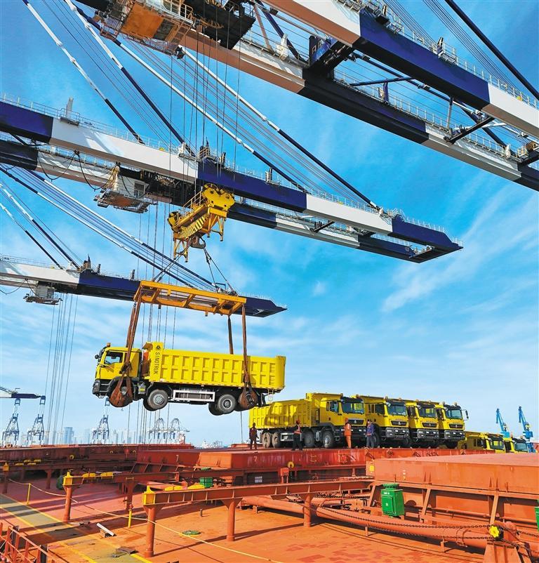 ▲1月25日,出口几内亚的工程车辆在山东港口烟台港装入中非班轮“韦立信心”轮。烟台港中非班轮开通以来,已累计完成对非设备物资发运量600多万吨。