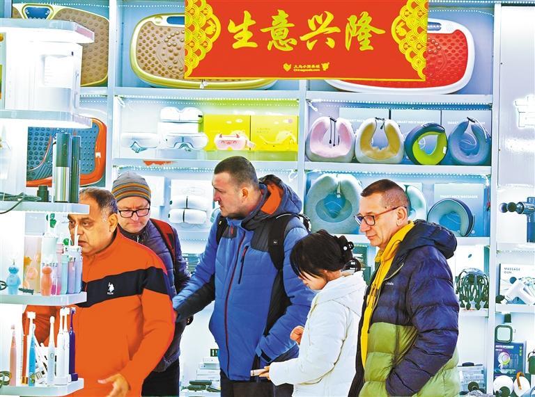 ◀1月25日,浙江省义乌市国际商贸城,来自波斯尼亚的外商正在采购电动小家庭商品。义乌市出台政策,扶持企业产品出口创汇。