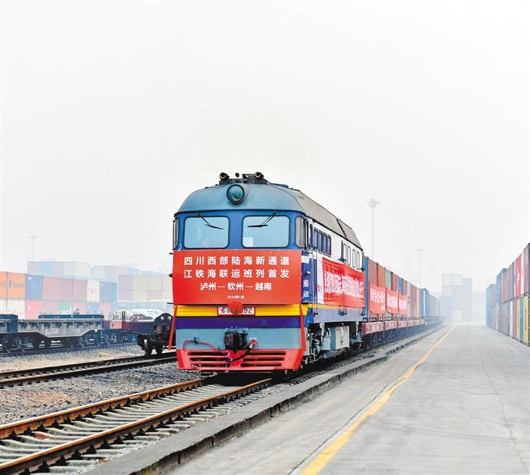 ▲1月12日,四川泸州港,满载25组集装箱货物的班列从四川泸州港站驶出,驶向越南、孟加拉国等国家。这是四川西部陆海新通道江铁海联运首发。