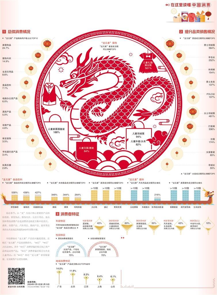 “龙元素”带火传统文化消费。不少人选购了龙生肖服饰,图个鸿运当头、龙年大吉的彩头。销售数据显示,带有“龙元素”的女士汉服成交额同比增长近2倍,龙形发簪的成交额增速更是近6倍。不少消费者为小朋友购置了“龙元素”儿童家居服,“小龙人”服饰成交额同比增长近200%,带有“龙元素”的儿童演出服的成交额更是同比增长超5倍。
