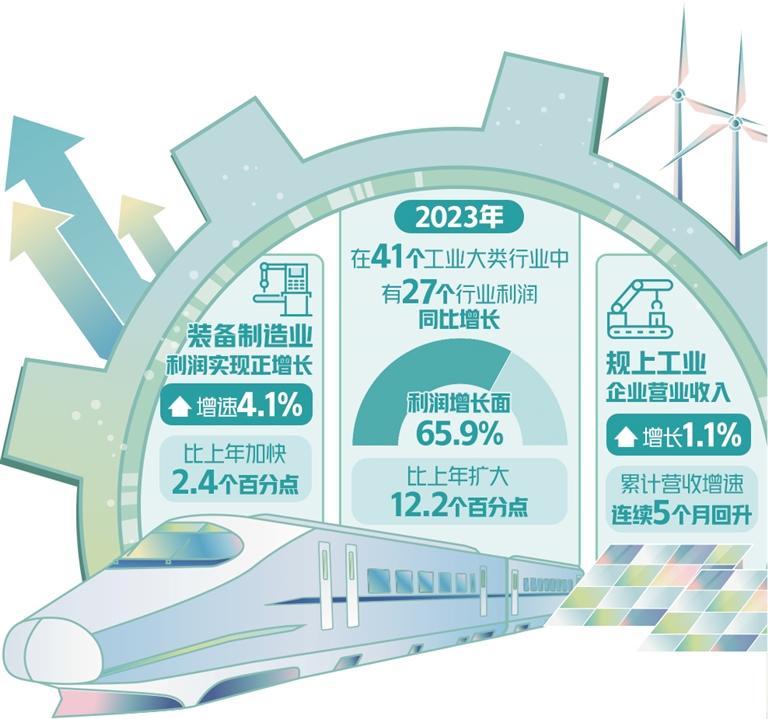 超六成行业全年利润实现增长,七成行业利润呈回升态势。2023年,在41个工业大类行业中,有27个行业利润比上年增长,利润增长面为65.9%,比上年扩大12.2个百分点;有29个行业全年利润增速比前11月加快或降幅收窄、由降转增,呈回升态势,占70.7%。