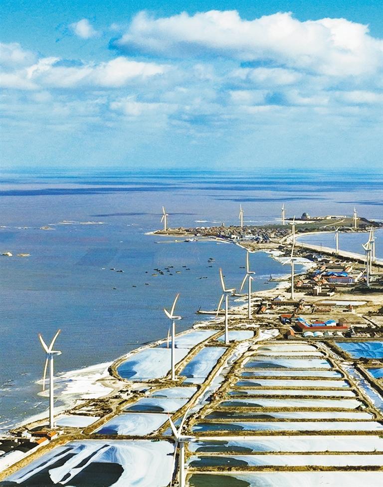 1月24日,山东省荣成市东楮岛风力发电场。近年来,依托沿海风能资源,荣成市建设多处大型风电场、光伏场,推进绿色能源产业发展。王福东摄(中经视觉)