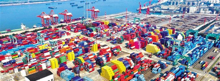 1月28日,在苏州港张家港港区集装箱码头,车船往来穿梭,货物有序装卸。