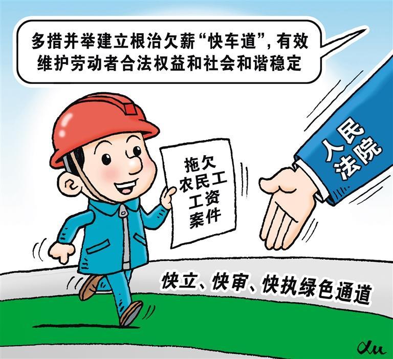 最高人民法院、人力资源和社会保障部、中华全国总工会日前联合发布涉欠薪纠纷典型案例,通过案例明晰欠薪纠纷多元化解决途径,强调多措并举,建立根治欠薪“快车道”,有效维护劳动者合法权益和社会和谐稳定。按时足额获得劳动报酬,是劳动者最关心的权益,保障其利益诉求快速实现意义重大。为此,人民法院完善拖欠农民工工资案件的快立、快审、快执绿色通道,充分运用“智慧法院”建设成果,打造在线诉讼平台,快速化解纠纷,确保劳动者及时兑现胜诉权益。临近岁末,让农民工安“薪”过年,务必推动根治欠薪工作落实落细,畅通维权渠道,兜牢民生底线,切实维护劳动者的合法权益。