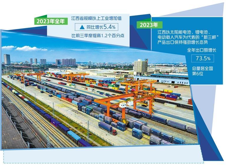 数据显示,2023年,江西以太阳能电池、锂电池、电动载人汽车为代表的“新三样”产品出口保持强劲增长态势,全年出口额增长73.5%,总量居全国第6位,成为拉动江西外贸增长的“新引擎”。