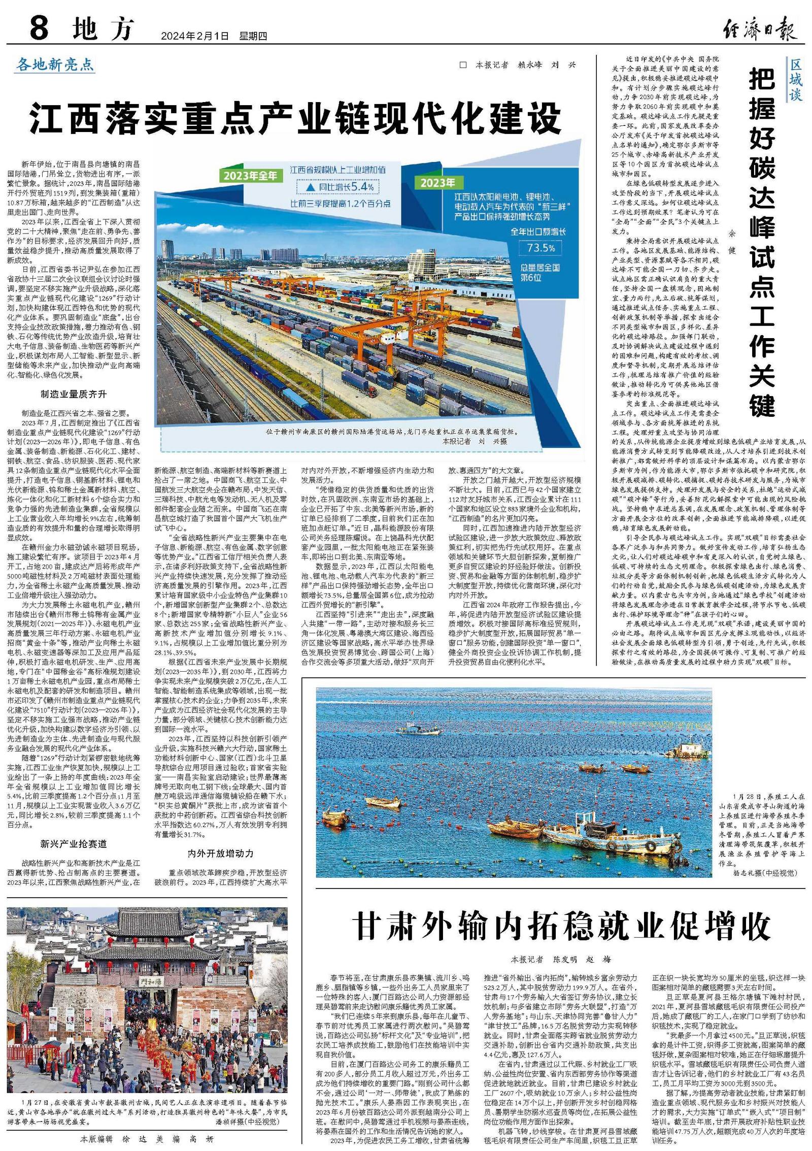 日前,江西省委书记尹弘在参加江西省政协十三届二次会议联组会议讨论时强调,要坚定不移实施产业升级战略,深化落实重点产业链现代化建设“1269”行动计划,加快构建体现江西特色和优势的现代化产业体系。要巩固制造业“底盘”,出台支持企业技改政策措施,着力推动有色、钢铁、石化等传统优势产业改造升级,培育壮大电子信息、装备制造、生物医药等新兴产业,积极谋划布局人工智能、新型显示、新型储能等未来产业,加快推动产业向高端化、智能化、绿色化发展。