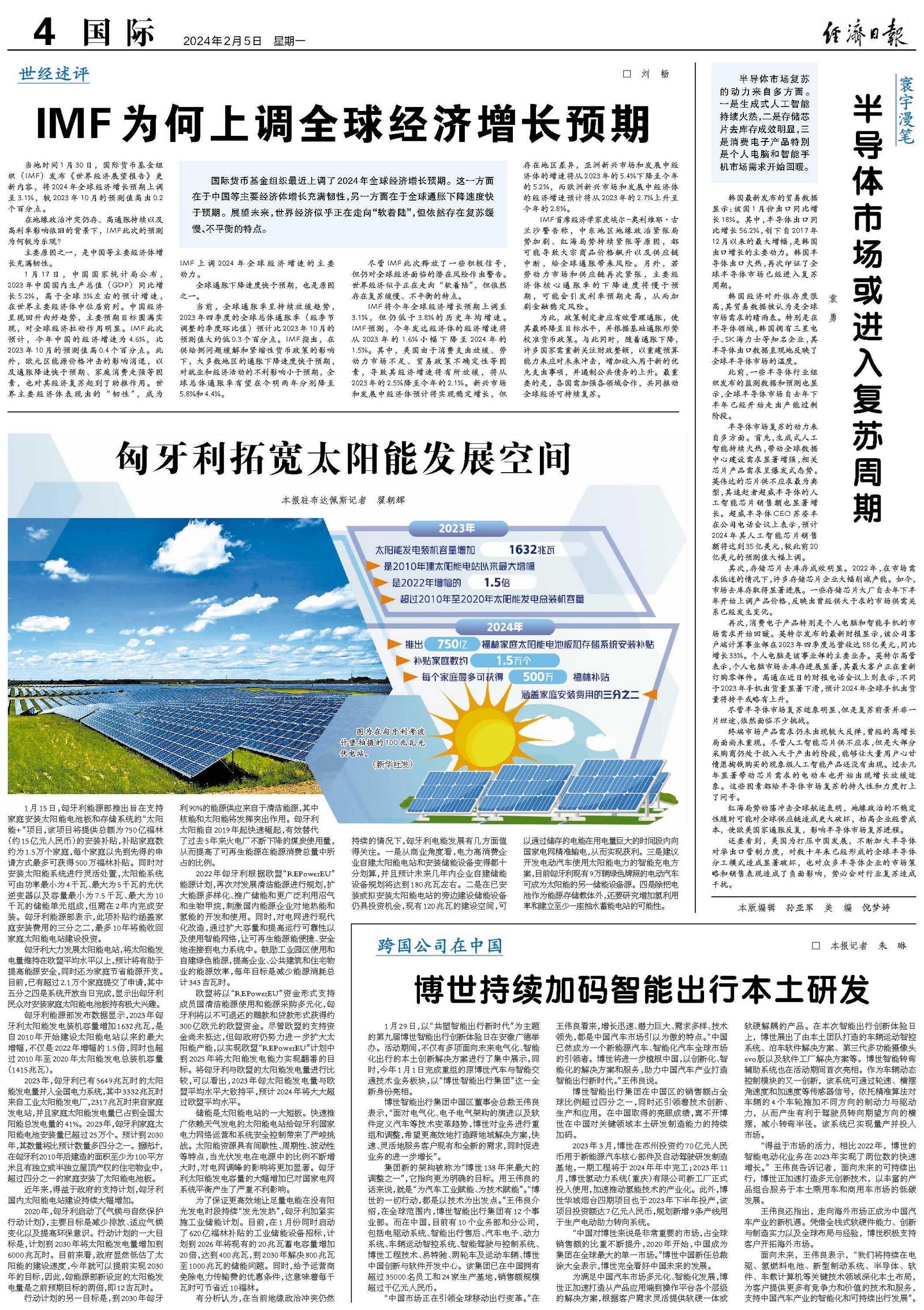 1月17日,中国国家统计局公布,2023年中国国内生产总值(GDP)同比增长5.2%,高于全球3%左右的预计增速,在世界主要经济体中位居前列。中国经济呈现回升向好趋势,主要预期目标圆满实现,对全球经济拉动作用明显。IMF此次预计,今年中国的经济增速为4.6%,比2023年10月的预测值高0.4个百分点。此外,欧元区能源价格冲击的影响消退,以及通胀降速快于预期、家庭消费走强等因素,也对其经济复苏起到了助推作用。世界主要经济体表现出的“韧性”,成为IMF上调2024年全球经济增速的主要动力。