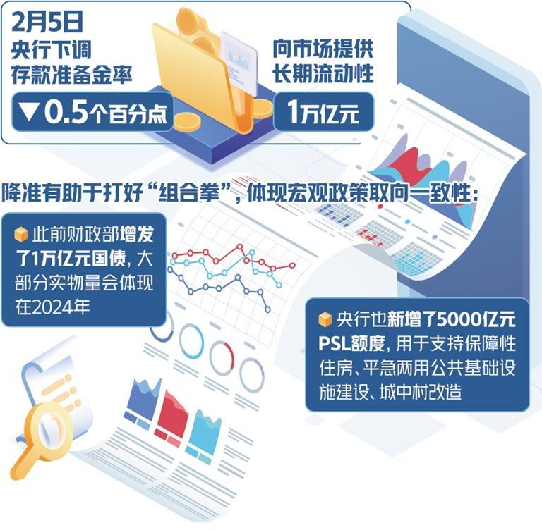 2月5日,今年首次降准落地。此前,中国人民银行行长潘功胜在1月24日举办的国新办发布会上宣布,2月5日下调存款准备金率0.5个百分点,向市场提供长期流动性1万亿元。