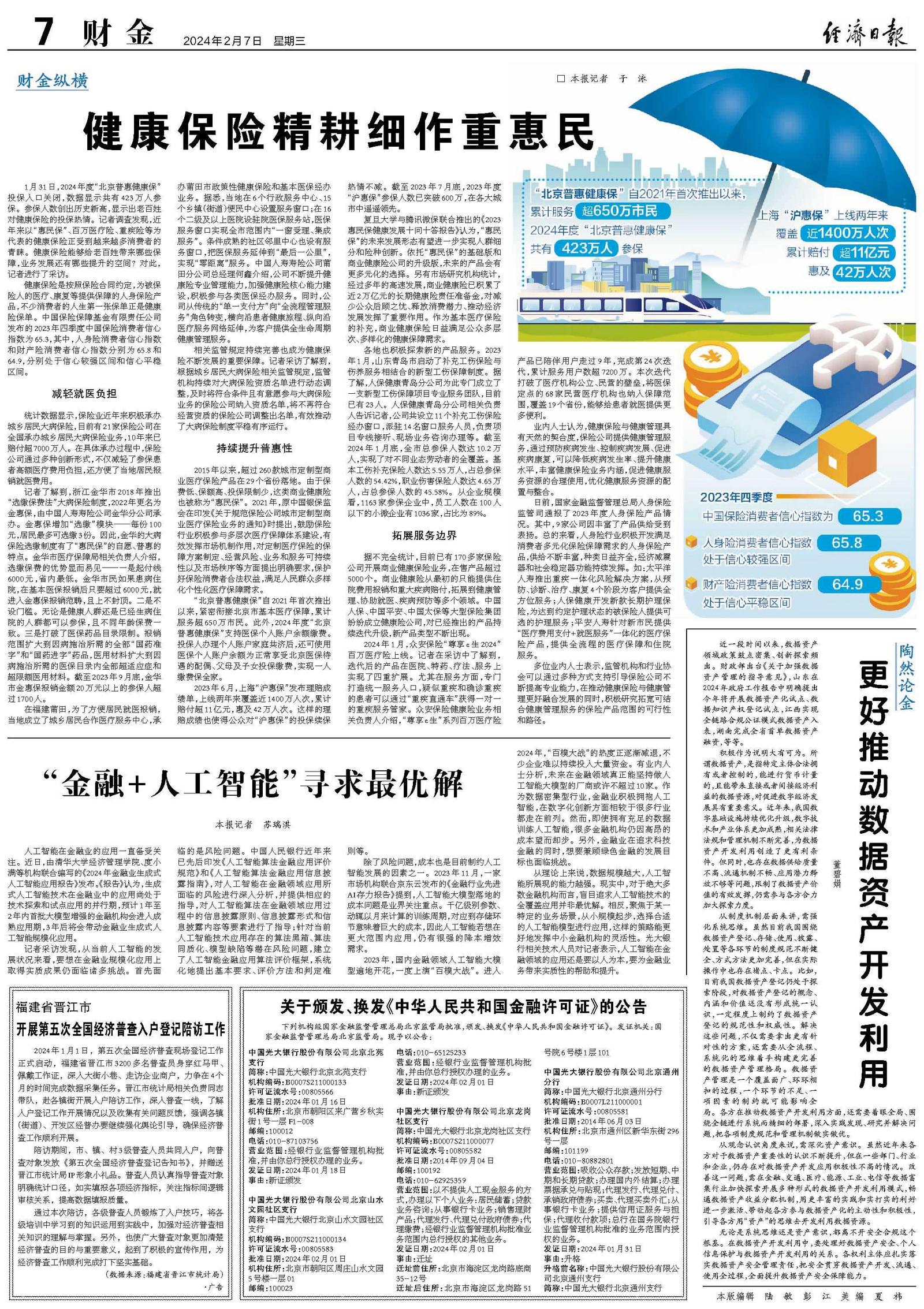 1月31日,2024年度“北京普惠健康保”投保入口关闭,数据显示共有423万人参保。参保人数创出历史新高,显示出老百姓对健康保险的投保热情。记者调查发现,近年来以“惠民保”、百万医疗险、重疾险等为代表的健康保险正受到越来越多消费者的青睐。健康保险能够给老百姓带来哪些保障,业务发展还有哪些提升的空间?对此,记者进行了采访。