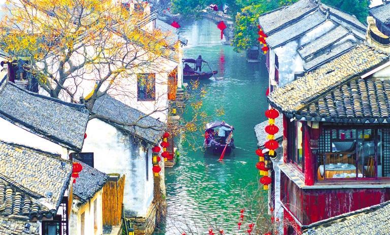 2月6日,游客在江苏省昆山市周庄古镇游览。随着龙年新春的临近,周庄古镇装扮一新,白墙、黛瓦、乌篷船与两岸红灯笼相映成趣,古镇水乡到处洋溢着浓厚的新春氛围。