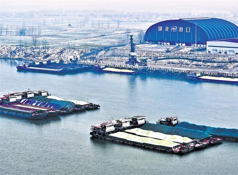 2月6日,湖北省襄阳市宜城小河港区综合码头,工作人员在转运化工原材料、矿石等大宗商品。小河港是汉江枢纽港,1月份吞吐量为6.1万吨,同比增长50%。安富斌摄(中经视觉)