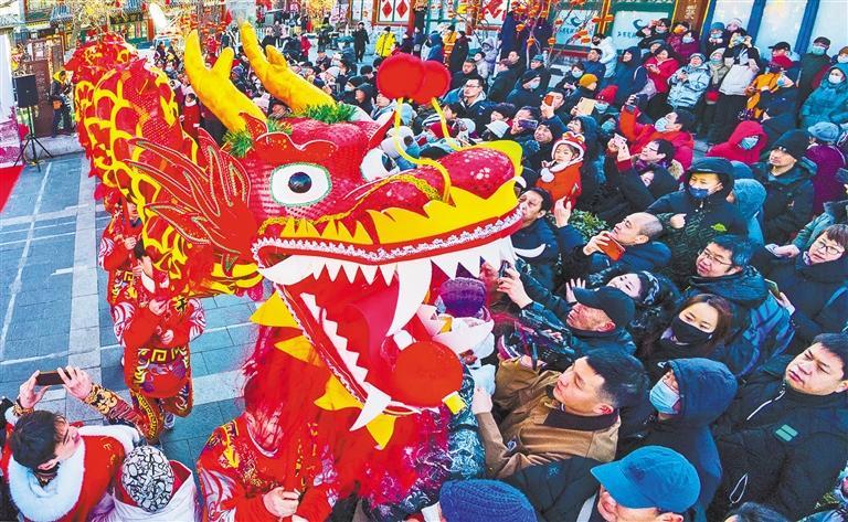 2月10日,北京市西城区厂甸庙会上的舞龙表演吸引游客拍照留念。2024年北京厂甸庙会于10日至14日在琉璃厂东、西街举办,以“漫步古都中轴,共赏百年厂甸”为主题,突出“文市”特色,让游客沉浸式感受街区的历史变迁和京味春节的民俗文化。孙立君摄(中经视觉)
