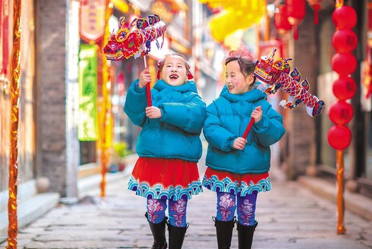 2月11日,一对双胞胎手持龙灯在江苏省兴化市昭阳街道八字桥文旅休闲街区游玩。