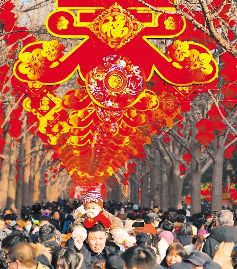 2月11日,北京地坛庙会银杏大道,熙熙攘攘的游客在观景游玩。