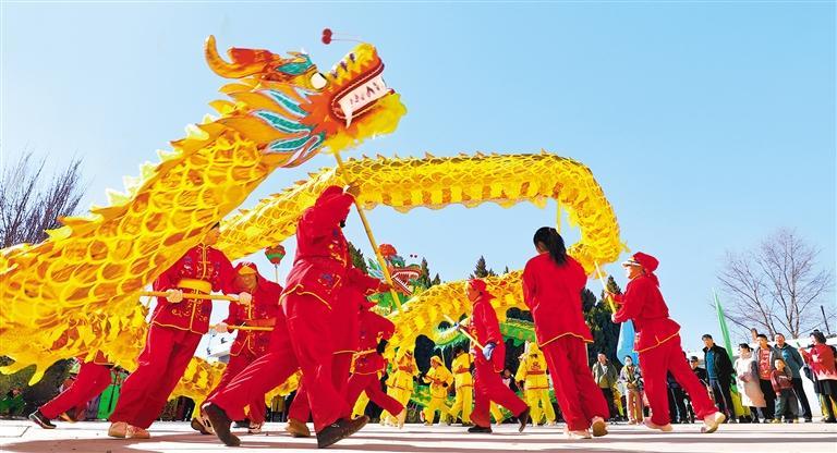 2月12日,甘肃省张掖市甘州区乌江镇平原村“万家和美”社火队的队员们在为群众表演非遗社火项目龙腾盛世。甘州社火按形式可分为锣鼓类、秧歌类、车船类、高跷类、武术类等,2011年被列为甘肃省非物质文化遗产项目。
