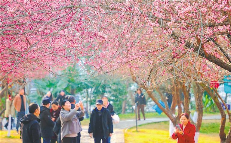 ⑥2月12日,四川射洪市平安风景区梅花竞相开放,游客赏花拍照。
