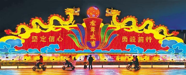 ①2月12日,山西朔州市巨龙造型的花灯熠熠生辉,吸引游人驻足观赏。