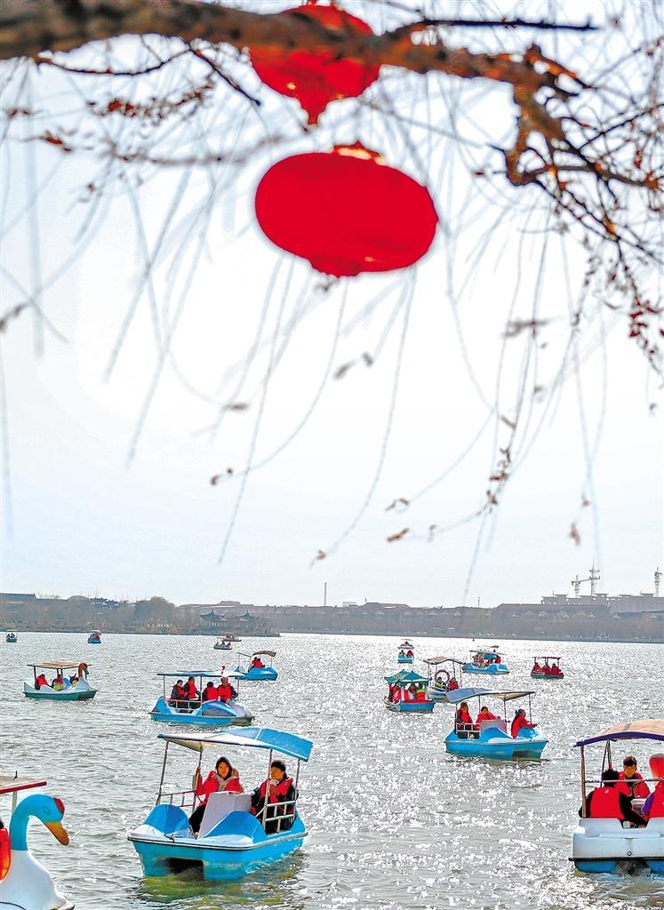 ④2月12日,河南睢县北湖景区,游客乘船游玩,乐享假日生活。