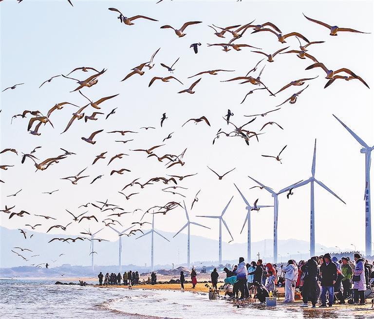 ⑥2月11日,山东省荣成市沿海景区,游客在观海鸥度新春。
