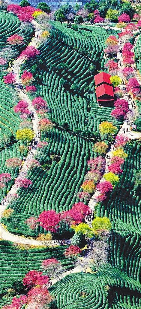 ⑦2月13日,福建省漳平市永福镇后孟村,游客在樱花茶园欣赏美景。