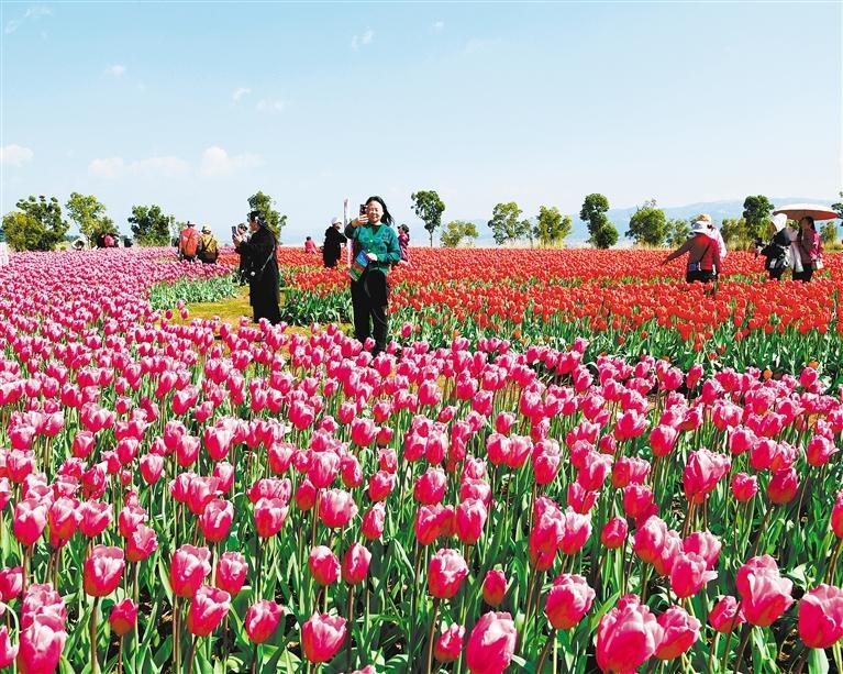 ②2月13日,云南省弥勒市太平湖森林公园郁金香竞相绽放,吸引游人欣赏。