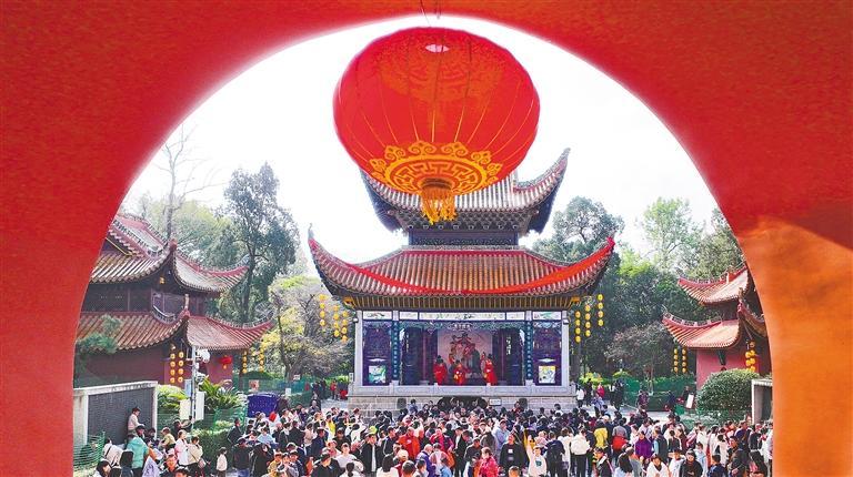④2月14日,湖南省衡阳市南岳区御街,游客在逛庙会、赏戏曲。