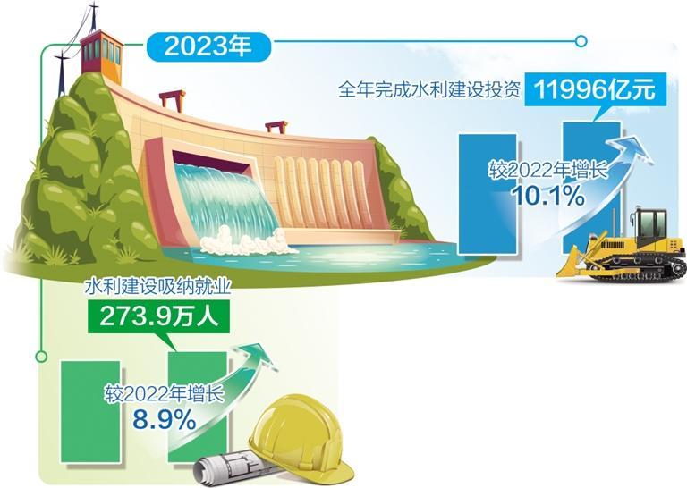 水利建设对促投资、惠民生、稳就业具有积极作用。2023年水利建设投资和规模创历史新高,全年完成水利建设投资11996亿元,水利建设吸纳就业273.9万人。