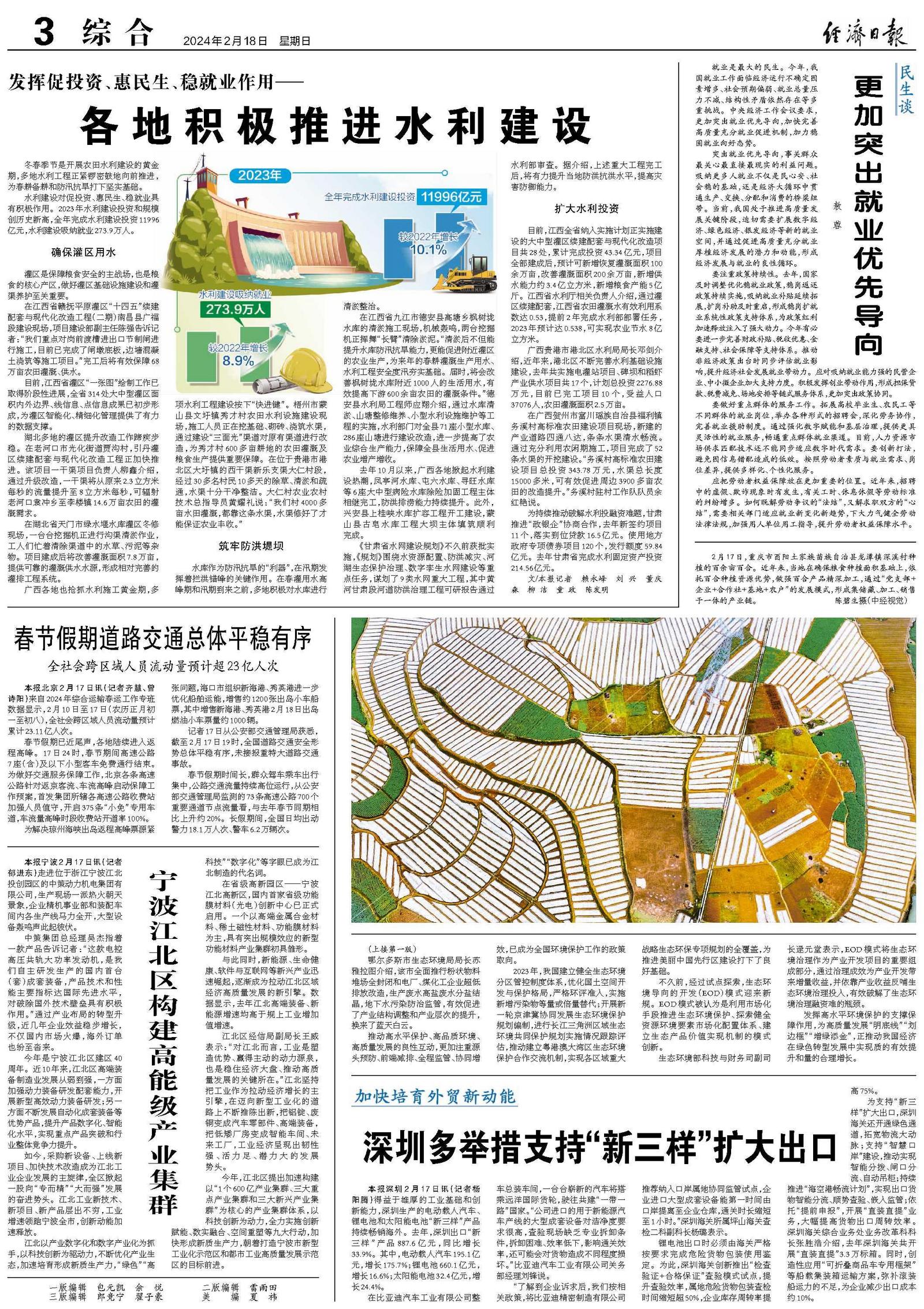 广西各地也抢抓水利施工黄金期,多项水利工程建设按下“快进键”。梧州市蒙山县文圩镇秀才村农田水利设施建设现场,施工人员正在挖基础、砌砖、浇筑水渠,通过建设“三面光”渠道对原有渠道进行改造,为秀才村600多亩耕地的农田灌溉及粮食生产提供重要保障。在位于贵港市港北区大圩镇的西干渠新乐支渠大仁村段,经过30多名村民10多天的除草、清淤和疏通,水渠十分干净整洁。大仁村农业农村技术总指导员黄耀礼说:“我们村4000多亩水田灌溉,都靠这条水渠,水渠修好了才能保证农业丰收。”