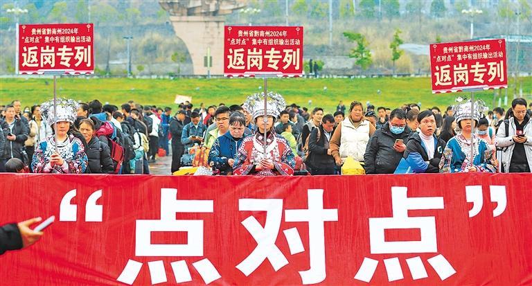 ▲2月17日,来自贵州黔南布依族苗族自治州的返岗务工人员在都匀东站准备乘坐返岗专列。