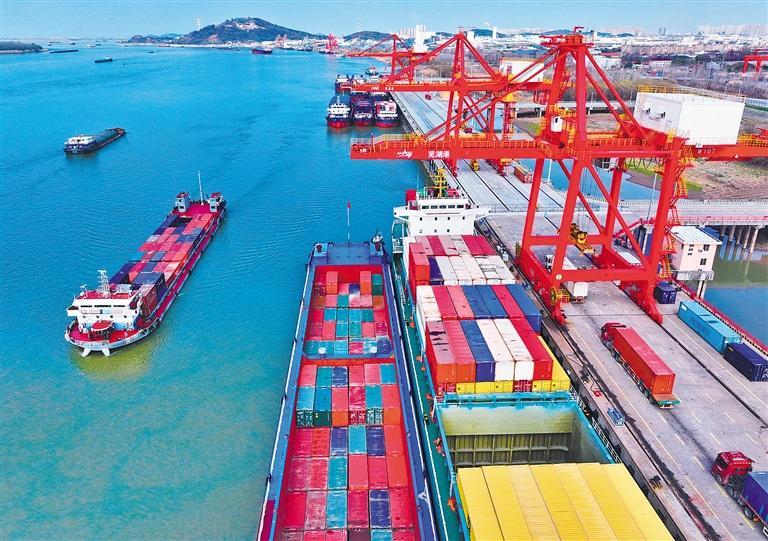 ▲2月17日,安徽港口集团芜湖港朱家桥国际集装箱码头作业现场一派繁忙。王玉实摄(中经视觉)