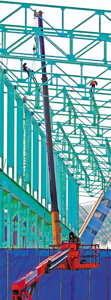 ◀2月17日,内蒙古兴安盟敬业集团乌兰浩特钢铁有限公司双高棒技改工程现场,建设者在安装屋面檩条。郑志宏摄(中经视觉)