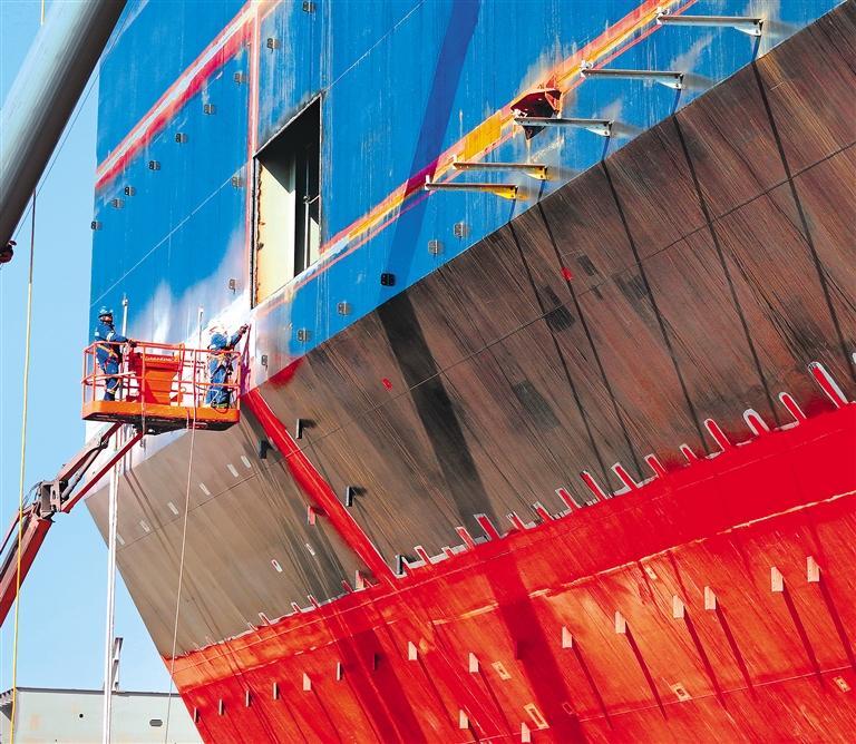 ◀2月17日,山东烟台中集来福士海洋工程有限公司,员工在一艘大型船舶建造现场作业。