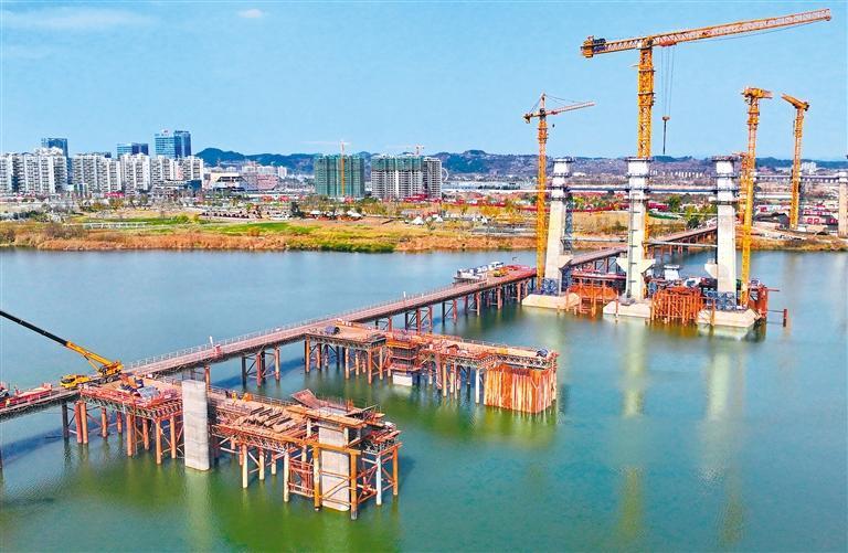 2月18日,四川省遂宁市涪江六桥项目建设现场,工人们正铆足劲加紧施工,确保项目进度。该项目为当地重点工程项目,也是连通市城区、推动缓堵保畅的民生工程,建成后可提升通行效率,带动城市向北向东发展。刘昌松摄