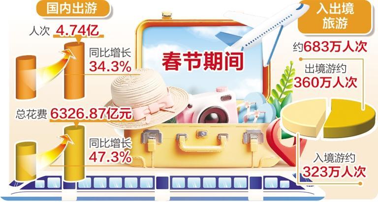经文旅部数据中心测算,春节假期全国国内旅游出游4.74亿人次,同比增长34.3%,按可比口径较2019年同期增长19%;国内游客出游总花费6326.87亿元,同比增长47.3%,按可比口径较2019年同期增长7.7%;入出境旅游约683万人次,其中出境游约360万人次,入境游约323万人次。