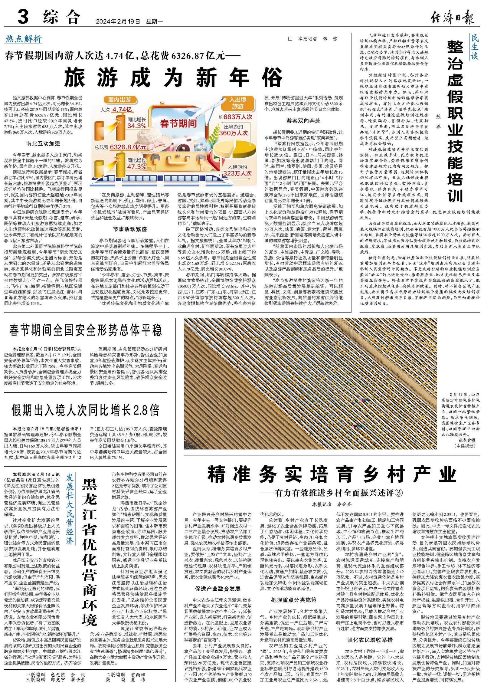 业内认为,精准务实培育乡村产业,要做好“土特产”文章,坚持产业兴农、质量兴农、绿色兴农,加快构建粮经饲统筹、农林牧渔并举、产加销贯通、农文旅融合的现代乡村产业体系,把农业建成现代化大产业。