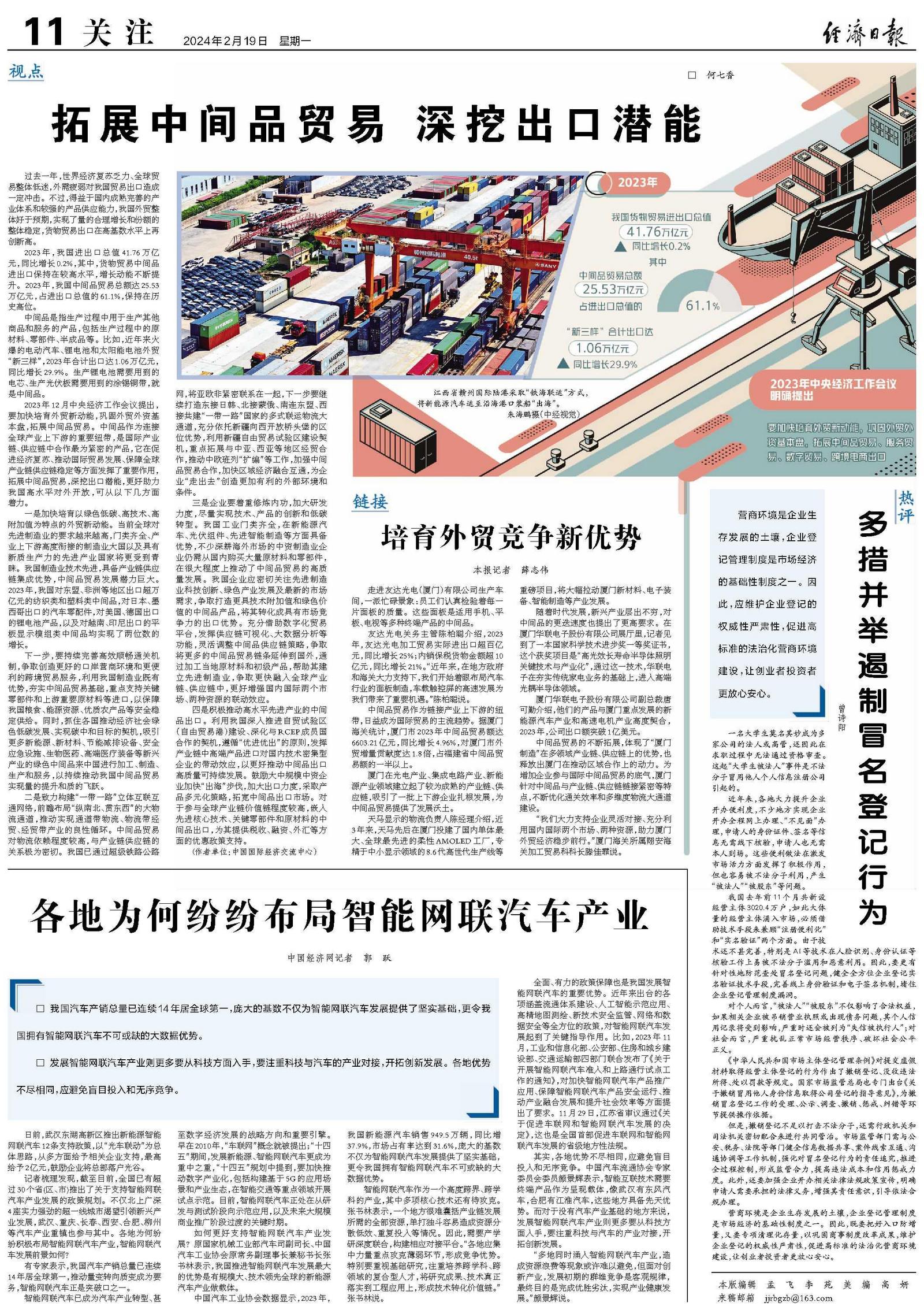 全面、有力的政策保障也是我国发展智能网联汽车的重要优势。近年来出台的各项涵盖流通体系建设、人工智能示范应用、高精地图测绘、新技术安全监管、网络和数据安全等全方位的政策,对智能网联汽车发展起到了关键指导作用。比如,2023年11月,工业和信息化部、公安部、住房和城乡建设部、交通运输部四部门联合发布了《关于开展智能网联汽车准入和上路通行试点工作的通知》,对加快智能网联汽车产品推广应用、保障智能网联汽车产品安全运行、推动产业融合发展和提升社会效率等方面提出了要求。11月29日,江苏省审议通过《关于促进车联网和智能网联汽车发展的决定》,这也是全国首部促进车联网和智能网联汽车发展的省级地方性法规。