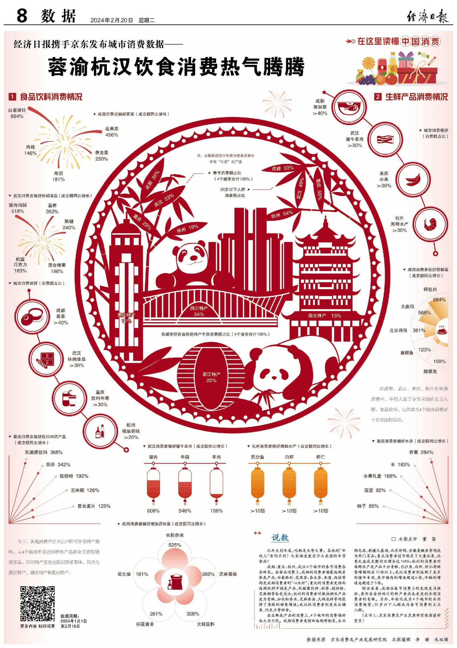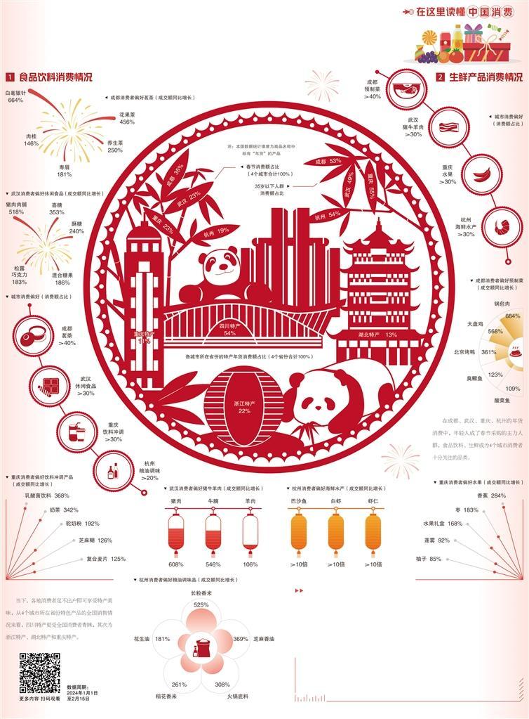 成都、重庆、杭州、武汉4个城市的春节消费各具特色。在食品消费上,成都的消费者偏爱选购茗茶类产品,白毫银针、花果茶、养生茶、寿眉、肉桂等均是成都消费者的“心头好”;重庆的消费者更倾向选购饮料冲调类产品,乳酸菌饮料、奶茶、驼奶粉、芝麻糊等备受关注;杭州的消费者对粮油调味产品更为青睐,如长粒香米、芝麻香油、火锅底料等均获得了亮眼的销售增速;武汉的消费者则更关注糖果、巧克力等甜食。