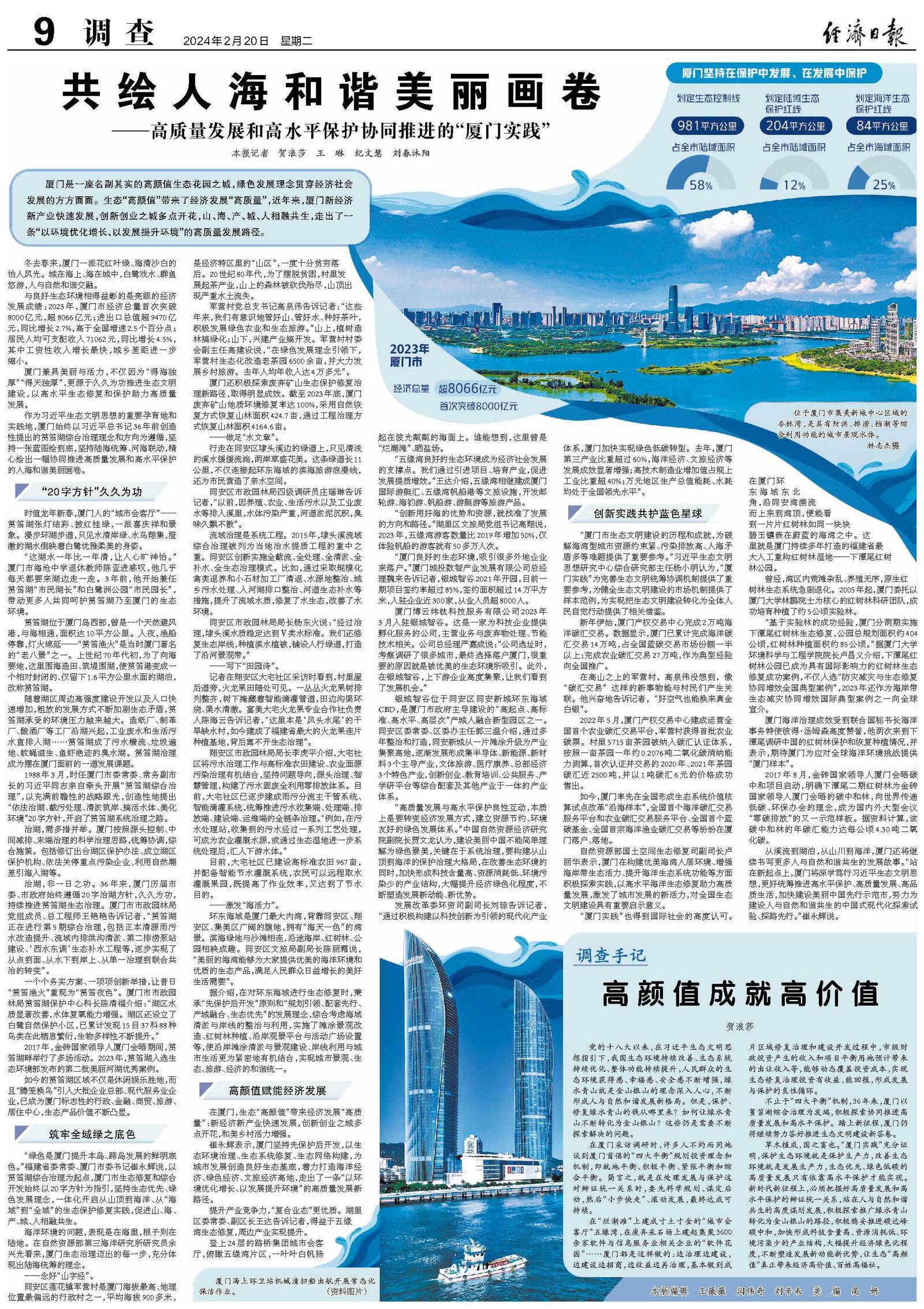 作为习近平生态文明思想的重要孕育地和实践地,厦门始终以习近平总书记36年前创造性提出的筼筜湖综合治理理念和方向为遵循,坚持一张蓝图绘到底,坚持陆海统筹、河海联动,精心绘出一幅协同推进高质量发展和高水平保护的人海和谐美丽画卷。